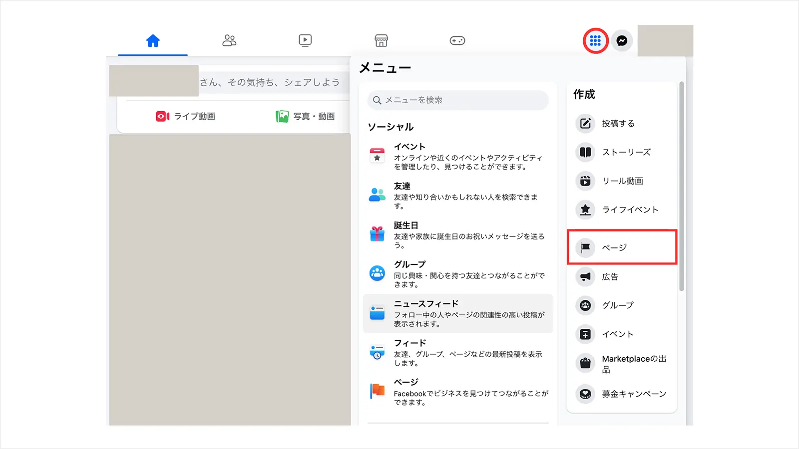 まず、個人用アカウントにログインし、画面右上のメニューをクリックします。表示された一覧から「ページ」を選択しましょう。