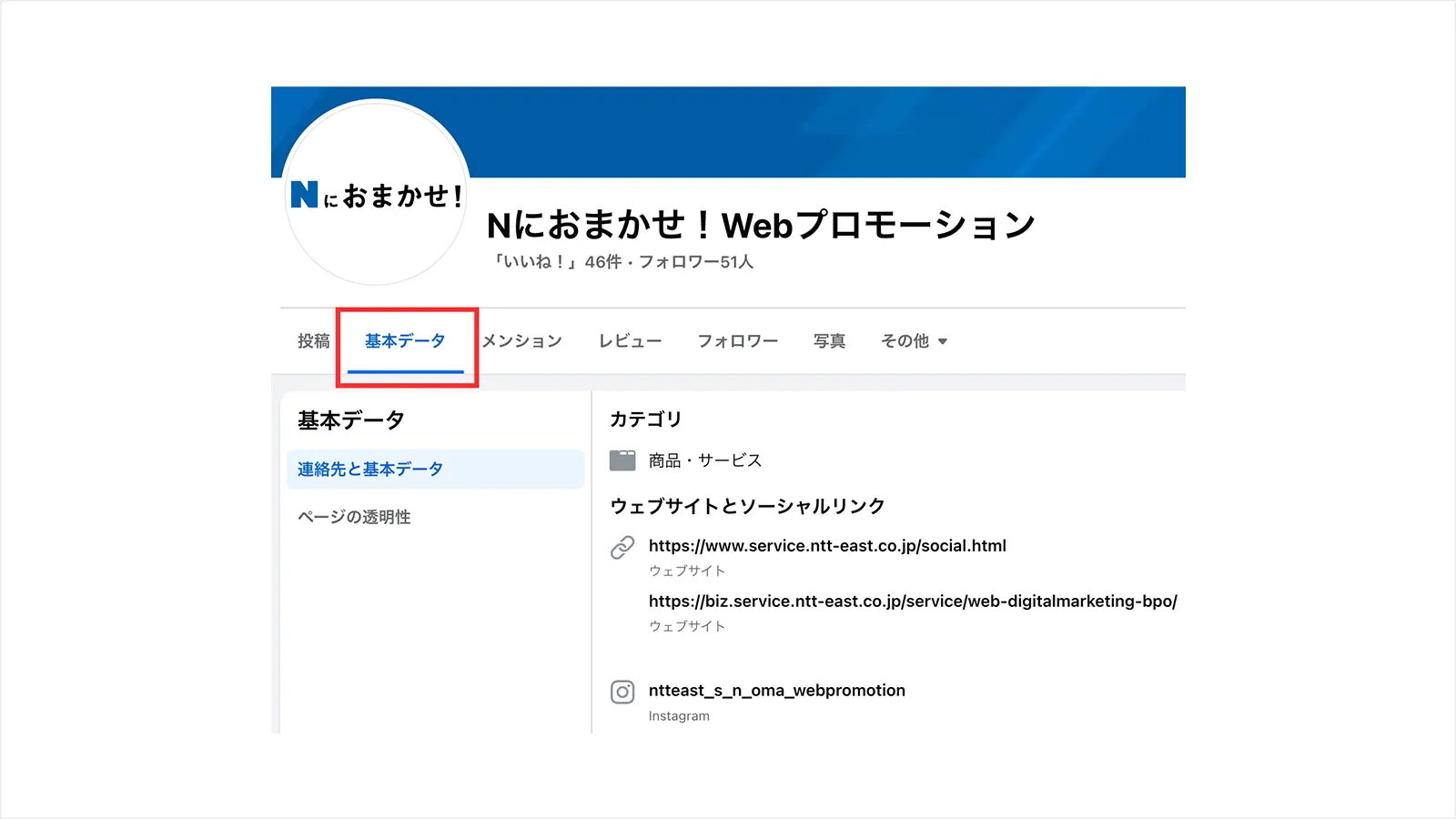 Facebookページでは、住所や電話番号、WebサイトのURLなど、ビジネスの基本情報をわかりやすく表示できます。トップ画面の「自己紹介」や「基本データ」タブにビジネスの概要がまとめられるため、顧客は必要な情報を一目で確認が可能です。