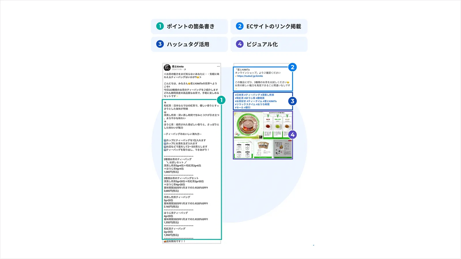 そこで「Nにおまかせ!」では、企画・画像制作・ライティング・投稿代行までを一貫サポート。投稿では、以下の4つの工夫で内容がコンパクトかつ明確になり、ECサイトへの導線が変化しました。