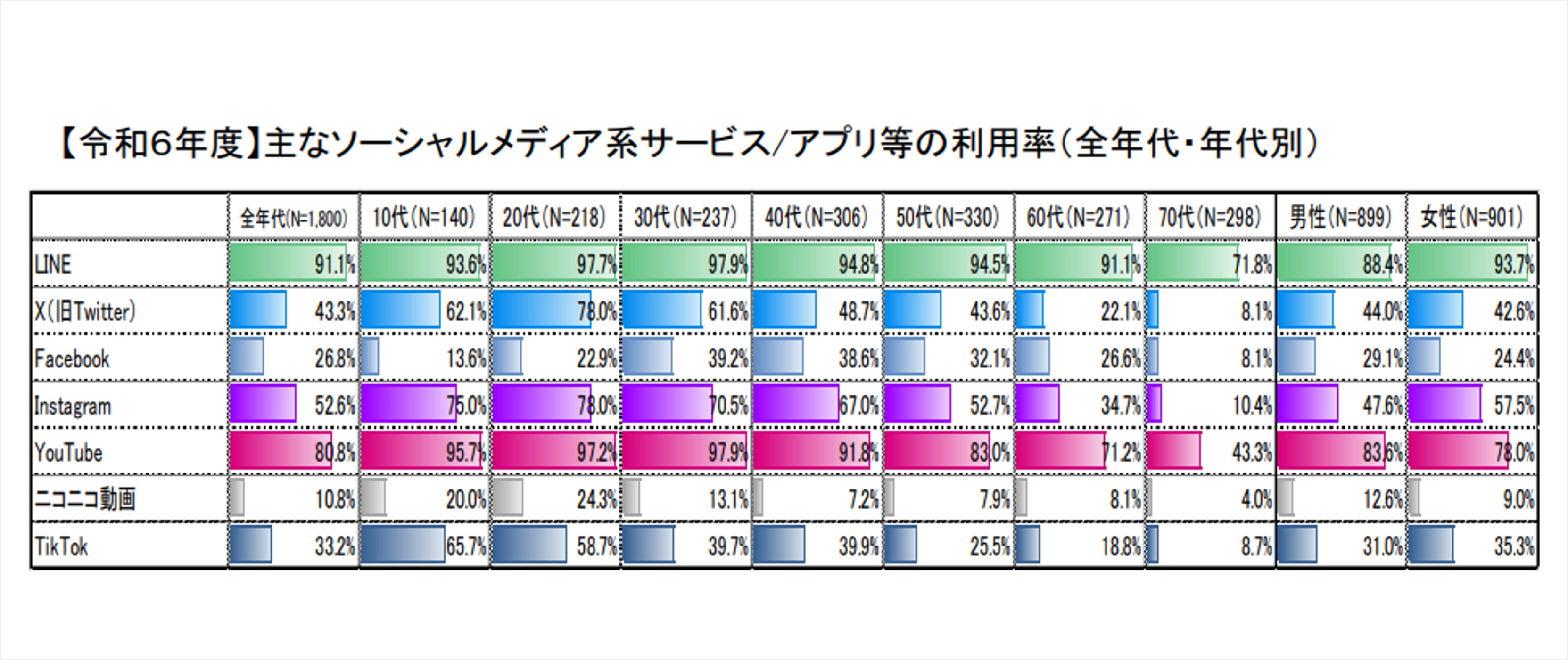 総務省の「令和6年度情報通信メディアの利用時間と情報行動に関する調査報告書<概要>」によると、Instagramの利用率は男性の47.6%に対して女性は57.5%であることから、とくに女性に支持されているSNSといえます。