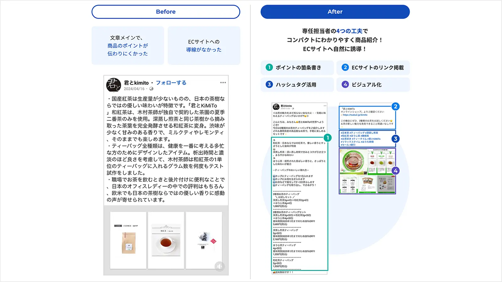 4つの工夫で内容がコンパクトかつ明確になり、ECサイトへの導線が変化していることがわかります。このような改善により、SNSを通じた集客効果が目に見える形で現れ、大きな成果につながりました。