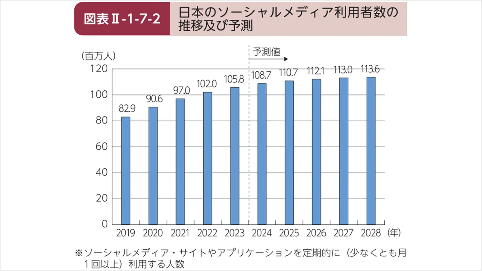 実際に、総務省の「令和6年版情報通信白書」によれば、日本国内のSNS利用者数は2023年に1億580万人を超え、2028年には1億1,360万人に達する見込みです。つまりSNSは、今や限られた層が使うものではなく、ほとんどの人が日常的に触れるメディアに変化しているといえるでしょう。