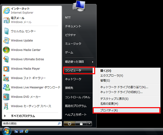 スタートメニューが表示されますので、【コンピュータ】を右クリックし、表示される小さなメニューの【プロパティ】をクリックしてください。