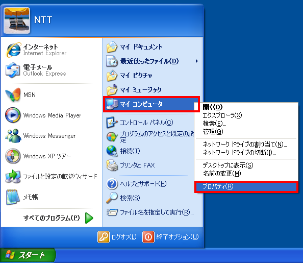 スタートメニューが表示されますので、【マイコンピュータ】を右クリックし、表示される小さなメニューの【プロパティ】をクリックしてください。