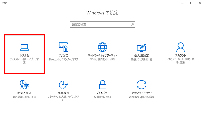 「設定」が表示されましたら、【システム】をタップまたはクリックしてください。