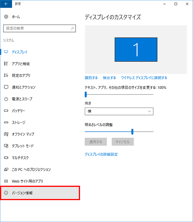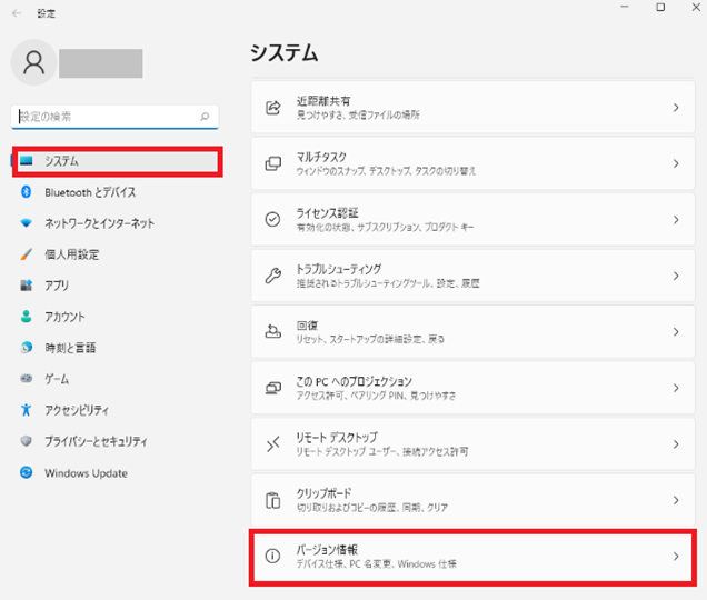 左メニューより 【システム】 をクリックし、右メニューより 【バージョン情報】 をクリックしてください。