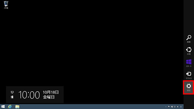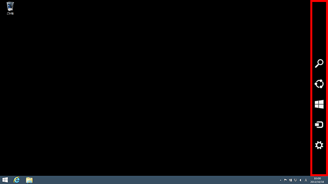 マウスポインタをデスクトップの右上または右下に合わせるか、画面の右端を内側にスワイプして、チャームを表示してください。