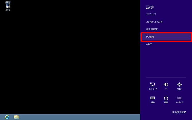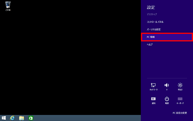 設定チャームが表示されますので、【PC 情報】をタップまたはクリックしてください。